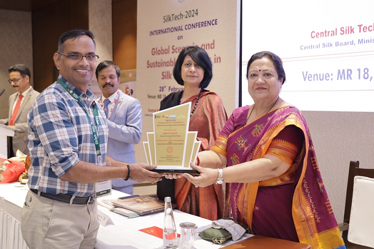 Mr. Devi Ramana Reddy, ISCM head at Taneira, accepting recognition for the commercialization of Computerized Zari Testing, a non-destructive zari testing protocol at Bharat Tex-2024, New Delhi