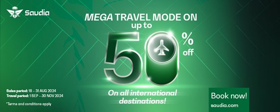 Saudia guests can take advantage of this promotional offer and book their tickets from August 18 to 31, 2024, for travel between September 1 and November 30, 2024. The offer applies to both Business and Guest Class, allowing guests to craft bespoke journeys across four continents aboard Saudias fleet.