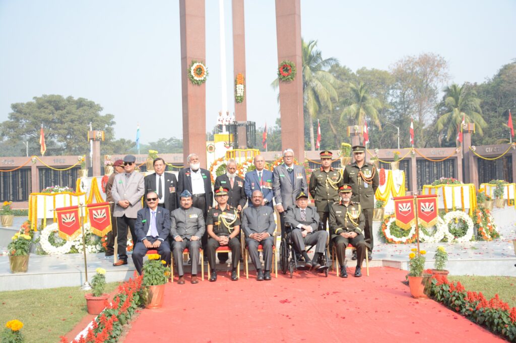 Wreaths were laid by dignitaries including Maj Gen Rajesh Arun Moghe, VSM, GOC, Bengal Sub Area, Lt Gen RC Srikanth, VSM, COS, HQ Eastern Command, Maj Gen Abdus Salam Chowdhury (Retd) of Bangladesh delegation and Brig Gen Md Aminur Rahman, Military Delegation Leader, Bangladesh, Air Chief Marshal Arup Raha, PVSM, AVSM, VM, ADC (Retd), Gen Shankar Roy Chowdhury, PVSM, AVSM (Retd), Lt Gen RC Tiwari, UYSM, AVSM, SM, GOC-in-C, Eastern Command and Dr CV Ananda Bose, Hon’ble Governor of West Bengal laid the final wreath in conjunction with a poignant flower petal drop orchestrated by Army Aviation helicopters.
