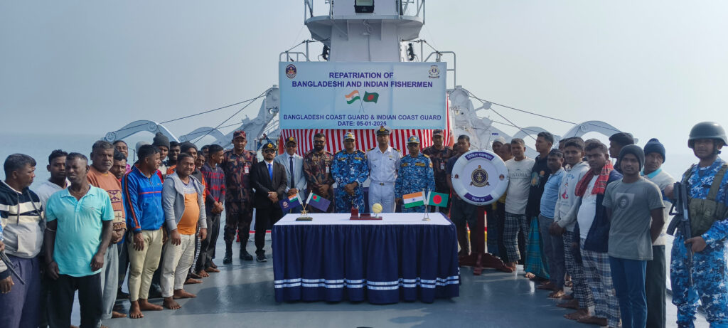 Accordingly, The Indian Coast Guard Ship Varad and ICGS Amrit Kaur were nominated to escort the 90 Bangladeshi fishermen to International Maritime Boundary Line (IMBL) for mutual exchange with 95 Indian Fishermen on 05 Jan 25. Further, the Indian fishermen were handed over to District Magistrate, 24 South Paragnas near Sagar Island on 06 Jan 25 at 1130 hours.