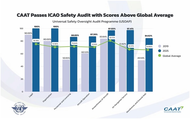 The Civil Aviation Authority of Thailand (CAAT) announced the results of the audit on the civil aviation safety oversight system under the Universal Safety Oversight Audit Programme – Continuous Monitoring Approach (USOAP CMA) of the International Civil Aviation Organization (ICAO), conducted from 27 August to 8 September 2025.